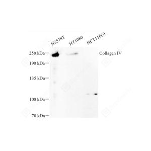 | WB检测Collagen IV蛋白(货号 GB115688). 样品: 经RIPA裂解液(货号G2002)处理的蛋白质. 封闭: 3%脱脂牛奶(货号GC310001)溶于TBST溶液, 室温孵育1小时. —抗: 1: 300稀释, 4℃ 孵育过夜. 二抗: HRP标记山羊抗兔IgG (H+L) (货号GB23303), 1: 5000稀释, 室温孵育1小时. |