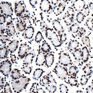 IHC检测Phospho-p70 S6 Kinase (T389)蛋白(货号 GB153805). 样品: 人胃, 4%多聚甲醛 (货号G1101) 固定12-24小时. 抗原修复: 柠檬酸抗原修复液 (干粉, pH 6.0) (G1201), 高压锅均匀喷气计时2分钟. —抗: 1: 2000稀释, 4℃ 孵育过夜. 二抗: S-vision免疫组化多聚二抗(山羊抗兔),即用型 (货号G1302), 室温孵育20分钟. |