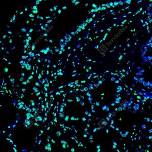 IF检测 Phospho-p70 S6 Kinase (T389)蛋白(货号 GB153805)(绿色). 样品: 人肺癌, 4%多聚甲醛 (货号G1101) 固定12-24小时. 抗原修复: 柠檬酸抗原修复液 (干粉, pH 6.0) (G1201), 高压锅均匀喷气计时2分钟. —抗: 1: 2000稀释, 4℃ 孵育过夜. 二抗: Alexa Fluor 488标记山羊抗兔IgG (H+L) (货号GB25303), 1: 400稀释, 室温孵育1小时. |