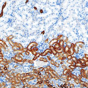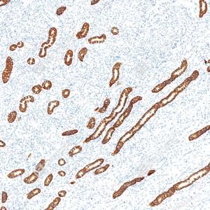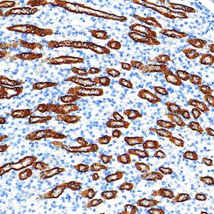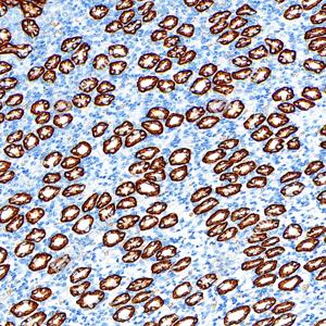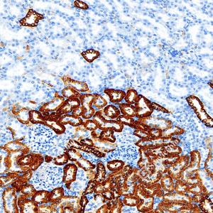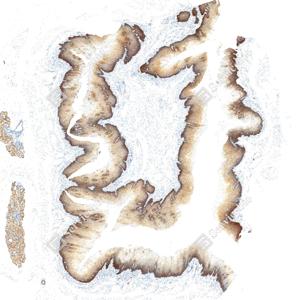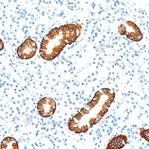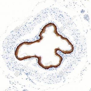| IHC检测Aquaporin 3蛋白(货号 GB15533). 样品: 人肾, 4%多聚甲醛 (货号G1101) 固定12-24小时. 抗原修复: 抗原修复仪 (货号 ARI-4),Tris-EDTA抗原修复液(pH 9.0) (货号G1203), 水浴100℃, 25分钟. —抗: 1: 2000稀释, 4℃ 孵育过夜. 二抗: S-vision免疫组化多聚二抗(山羊抗兔),即用型 (货号G1302), 室温孵育20分钟. |