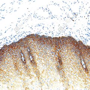 | IHC检测Aquaporin 3蛋白(货号 GB15533). 样品: 人食管, 4%多聚甲醛 (货号G1101) 固定12-24小时. 抗原修复: 抗原修复仪 (货号 ARI-4),Tris-EDTA抗原修复液(pH 9.0) (货号G1203), 水浴100℃, 25分钟. —抗: 1: 2000稀释, 4℃ 孵育过夜. 二抗: S-vision免疫组化多聚二抗(山羊抗兔),即用型 (货号G1302), 室温孵育20分钟. |