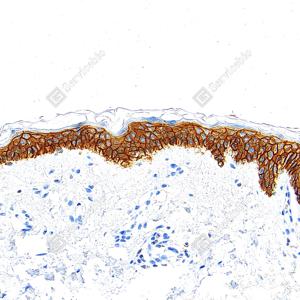 | IHC检测Aquaporin 3蛋白(货号 GB15533). 样品: 人皮肤, 4%多聚甲醛 (货号G1101) 固定12-24小时. 抗原修复: 抗原修复仪 (货号 ARI-4),Tris-EDTA抗原修复液(pH 9.0) (货号G1203), 水浴100℃, 25分钟. —抗: 1: 1000稀释, 4℃ 孵育过夜. 二抗: S-vision免疫组化多聚二抗(山羊抗兔),即用型 (货号G1302), 室温孵育20分钟. |