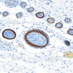 | IHC检测Aquaporin 3蛋白(货号 GB15533). 样品: 大鼠皮肤, 4%多聚甲醛 (货号G1101) 固定12-24小时. 抗原修复: 抗原修复仪 (货号 ARI-4),Tris-EDTA抗原修复液(pH 9.0) (货号G1203), 水浴100℃, 25分钟. —抗: 1: 1000稀释, 4℃ 孵育过夜. 二抗: S-vision免疫组化多聚二抗(山羊抗兔),即用型 (货号G1302), 室温孵育20分钟. |