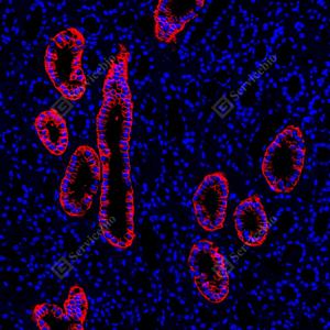 | IF检测Aquaporin 3蛋白(货号 GB15533)(红色). 样品: 小鼠肾, 4%多聚甲醛 (货号G1101) 固定12-24小时. 抗原修复: 抗原修复仪 (货号 ARI-4),Tris-EDTA抗原修复液(pH 9.0) (货号G1203), 水浴90℃, 30分钟. 封闭: 3% BSA(货号GC305010)的PBS溶液, 室温孵育30分钟. —抗: 1: 1000稀释, 4℃ 孵育过夜. 二抗: Cy3标记山羊抗兔IgG (H+L) (货号GB21303), 1: 300稀释, 室温孵育1小时. |