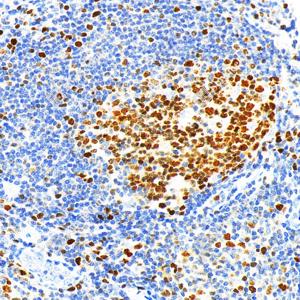 IHC检测KMT6/EZH2蛋白(货号 GB150019). 样品: 人扁桃体, 4%多聚甲醛 (货号G1101) 固定12-24小时. 抗原修复: 柠檬酸抗原修复液(干粉, pH 6.0) (G1201), 高压锅均匀喷气计时2分钟. —抗: 1: 500稀释, 4℃ 孵育过夜. 二抗: S-vision免疫组化多聚二抗(山羊抗兔),即用型 (货号G1302), 室温孵育20分钟. |