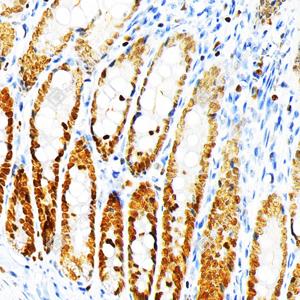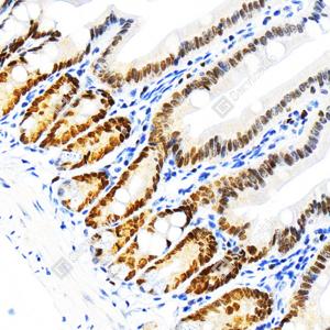 IHC检测KMT6/EZH2蛋白(货号 GB150019). 样品: 小鼠小肠, 4%多聚甲醛 (货号G1101) 固定12-24小时. 抗原修复: 柠檬酸抗原修复液(干粉, pH 6.0) (G1201), 高压锅均匀喷气计时2分钟. —抗: 1: 500稀释, 4℃ 孵育过夜. 二抗: S-vision免疫组化多聚二抗(山羊抗兔),即用型 (货号G1302), 室温孵育20分钟. |
