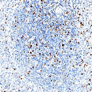 IHC检测KMT6/EZH2蛋白(货号 GB150019). 样品: 大鼠脾, 4%多聚甲醛 (货号G1101) 固定12-24小时. 抗原修复: 柠檬酸抗原修复液(干粉, pH 6.0) (G1201), 高压锅均匀喷气计时2分钟. —抗: 1: 500稀释, 4℃ 孵育过夜. 二抗: S-vision免疫组化多聚二抗(山羊抗兔),即用型 (货号G1302), 室温孵育20分钟. |