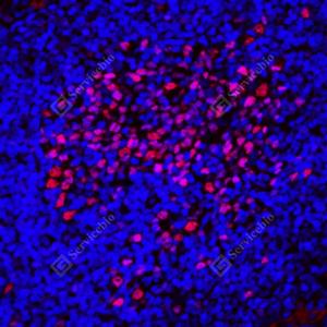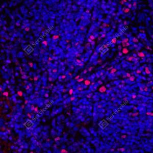 IF检测KMT6/EZH2蛋白(货号 GB150019)(红色). 样品: 小鼠脾, 4%多聚甲醛 (货号G1101) 固定12-24小时. 抗原修复: 柠檬酸抗原修复液(干粉, pH 6.0) (G1201), 高压锅均匀喷气计时2分钟. 封闭: 3% BSA(货号GC305010)的PBS溶液, 室温孵育30分钟. —抗: 1: 500稀释, 4℃ 孵育过夜. 二抗: Cy3标记山羊抗兔IgG (H+L) (货号GB21303), 1: 300稀释, 室温孵育1小时. |
