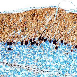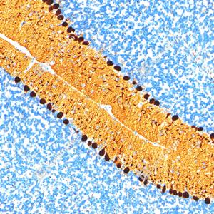 IHC检测Calbindin蛋白(货号 GB151211). 样品: 小鼠小脑, 4%多聚甲醛 (货号G1101) 固定12-24小时. 抗原修复: 柠檬酸抗原修复液(干粉, pH 6.0) (G1201), 高压锅均匀喷气计时2分钟. —抗: 1: 500稀释, 4℃ 孵育过夜. 二抗: S-vision免疫组化多聚二抗(山羊抗兔),即用型 (货号G1302), 室温孵育20分钟. |