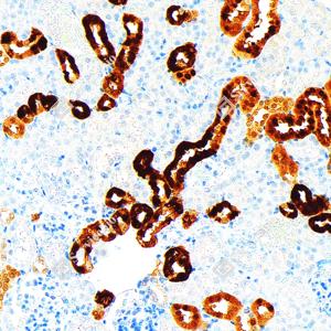 IHC检测Calbindin蛋白(货号 GB151211). 样品: 大鼠肾, 4%多聚甲醛 (货号G1101) 固定12-24小时. 抗原修复: 柠檬酸抗原修复液(干粉, pH 6.0) (G1201), 高压锅均匀喷气计时2分钟. —抗: 1: 500稀释, 4℃ 孵育过夜. 二抗: S-vision免疫组化多聚二抗(山羊抗兔),即用型 (货号G1302), 室温孵育20分钟. |