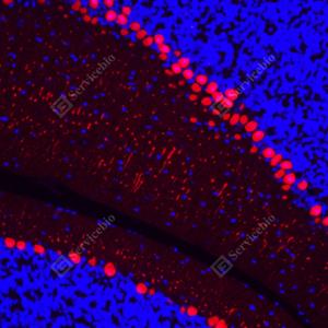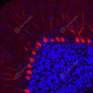 IF检测Calbindin蛋白(货号 GB151211)(红色). 样品: 小鼠小脑, 4%多聚甲醛 (货号G1101) 固定12-24小时. 抗原修复: 柠檬酸抗原修复液(干粉, pH 6.0) (G1201), 高压锅均匀喷气计时2分钟. 封闭: 3% BSA(货号GC305010)的PBS溶液, 室温孵育30分钟. —抗: 1: 500稀释, 4℃ 孵育过夜. 二抗: Cy3标记山羊抗兔IgG (H+L) (货号GB21303), 1: 300稀释, 室温孵育1小时. |