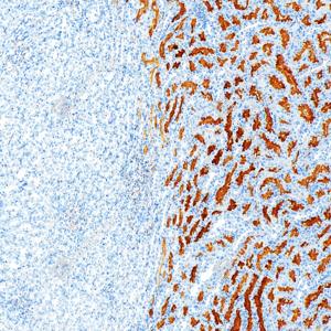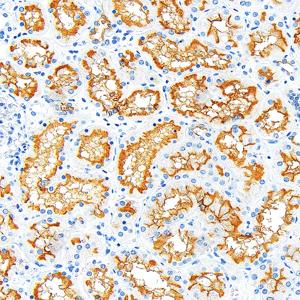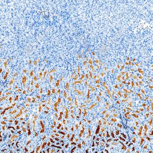 | IHC检测P Glycoprotein蛋白(货号 GB155718). 样品: 人肾, 4%多聚甲醛 (货号G1101) 固定12-24小时. 抗原修复: 抗原修复仪 (货号 ARI-4),Tris-EDTA抗原修复液(pH 9.0) (货号G1203), 水浴100℃, 25分钟. —抗: 1: 1500稀释, 4℃ 孵育过夜. 二抗: S-vision免疫组化多聚二抗(山羊抗兔),即用型 (货号G1302), 室温孵育20分钟. |
