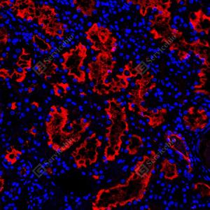 | IF检测P Glycoprotein蛋白(货号 GB155718)(红色). 样品: 人肾, 4%多聚甲醛 (货号G1101) 固定12-24小时. 抗原修复: 抗原修复仪 (货号 ARI-4),Tris-EDTA抗原修复液(pH 9.0) (货号G1203), 水浴90℃, 30分钟. 封闭: 3% BSA(货号GC305010)的PBS溶液, 室温孵育30分钟. —抗: 1: 1500稀释, 4℃ 孵育过夜. 二抗: Cy3标记山羊抗兔IgG (H+L) (货号GB21303), 1: 300稀释, 室温孵育1小时. |