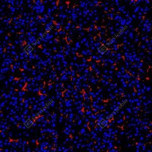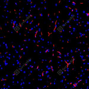 | IF检测P Glycoprotein蛋白(货号 GB155718)(红色). 样品: 大鼠脑, 4%多聚甲醛 (货号G1101) 固定12-24小时. 抗原修复: 抗原修复仪 (货号 ARI-4),Tris-EDTA抗原修复液(pH 9.0) (货号G1203), 水浴90℃, 30分钟. 封闭: 3% BSA(货号GC305010)的PBS溶液, 室温孵育30分钟. —抗: 1: 1500稀释, 4℃ 孵育过夜. 二抗: Cy3标记山羊抗兔IgG (H+L) (货号GB21303), 1: 300稀释, 室温孵育1小时. |