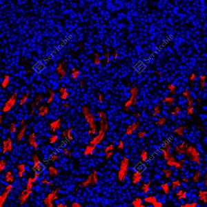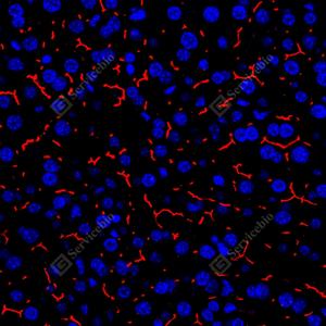 | IF检测P Glycoprotein蛋白(货号 GB155718)(红色). 样品: 小鼠肝, 4%多聚甲醛 (货号G1101) 固定12-24小时. 抗原修复: 抗原修复仪 (货号 ARI-4),Tris-EDTA抗原修复液(pH 9.0) (货号G1203), 水浴90℃, 30分钟. 封闭: 3% BSA(货号GC305010)的PBS溶液, 室温孵育30分钟. —抗: 1: 1500稀释, 4℃ 孵育过夜. 二抗: Cy3标记山羊抗兔IgG (H+L) (货号GB21303), 1: 300稀释, 室温孵育1小时. |