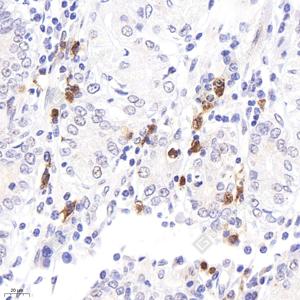 IHC检测CD177蛋白(货号 GB115051). 样品: 人胃癌, 4%多聚甲醛 (货号G1101) 固定12-24小时. 抗原修复: 柠檬酸抗原修复液(干粉, pH 6.0) (G1201), 98℃, 20分钟. —抗: 1: 250稀释, 4℃ 孵育过夜. 二抗: HRP标记山羊抗兔IgG (H+L) (货号GB23303), 1: 200稀释, 室温孵育1小时. |