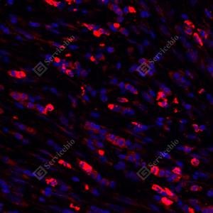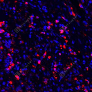 IF检测CD177蛋白(货号 GB115051)(红色). 样品: 人结肠癌, 4%多聚甲醛 (货号G1101) 固定12-24小时. 抗原修复: Tris-EDTA抗原修复液(pH 9.0) (G1203), 98℃, 20分钟. 封闭: 3% BSA(货号GC305010)的PBS溶液, 室温孵育30分钟. —抗: 1: 250稀释, 4℃ 孵育过夜. 二抗: Cy3标记山羊抗兔IgG (H+L) (货号GB21303), 1: 300稀释, 室温孵育1小时. |