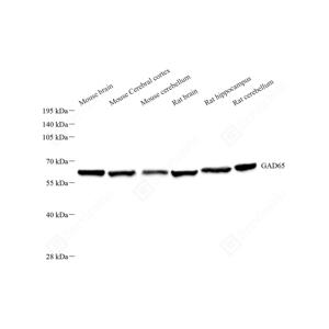 WB检测GAD65蛋白(货号 GB15562). 样品: 经RIPA裂解液(货号G2002)处理的蛋白质. 封闭: 3%脱脂牛奶(货号GC310001)溶于TBST溶液, 室温孵育1小时. —抗: 1: 500稀释, 4℃ 孵育过夜. 二抗: HRP标记山羊抗小鼠IgG (H+L) (货号GB23301), 1: 5000稀释, 室温孵育1小时. |