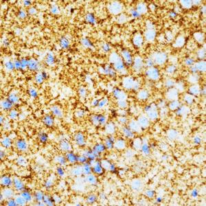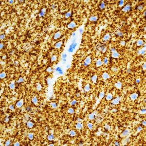 IHC检测GAD65蛋白(货号 GB15562). 样品: 大鼠脑, 4%多聚甲醛 (货号G1101) 固定12-24小时. 抗原修复: Tris-EDTA抗原修复液(pH 9.0) (G1203), 98℃, 20分钟. —抗: 1: 2000稀释, 4℃ 孵育过夜. 二抗: HRP标记山羊抗小鼠IgG (H+L) (货号GB23301), 1: 200稀释, 室温孵育1小时. |