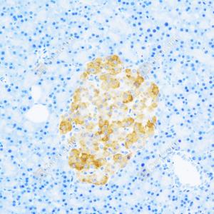 IHC检测GAD65蛋白(货号 GB15562). 样品: 大鼠胰腺, 4%多聚甲醛 (货号G1101) 固定12-24小时. 抗原修复: Tris-EDTA抗原修复液(pH 9.0) (G1203), 98℃, 20分钟. —抗: 1: 2000稀释, 4℃ 孵育过夜. 二抗: HRP标记山羊抗小鼠IgG (H+L) (货号GB23301), 1: 200稀释, 室温孵育1小时. |