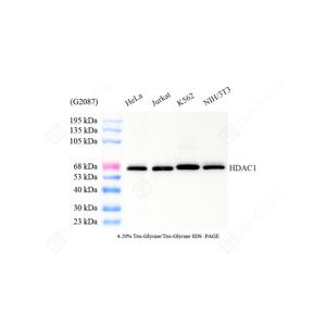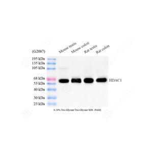 | WB检测HDAC1蛋白(货号 GB15333). 样品: 经RIPA裂解液(货号G2002)处理的蛋白质. 封闭: 3%脱脂牛奶(货号GC310001)溶于TBST溶液, 室温孵育1小时. —抗: 1: 1000稀释, 4℃ 孵育过夜. 二抗: HRP标记山羊抗兔IgG (H+L) (货号GB23303), 1: 5000稀释, 室温孵育1小时. |