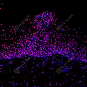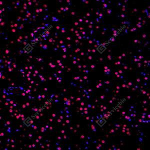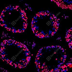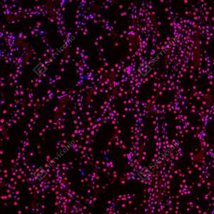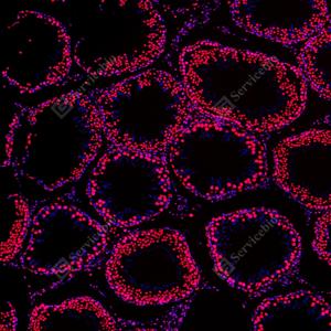 | IF检测HDAC1蛋白(货号 GB15333)(红色). 样品: 小鼠睾丸, 4%多聚甲醛 (货号G1101) 固定12-24小时. 抗原修复: 抗原修复仪 (货号 ARI-4),Tris-EDTA抗原修复液(pH 9.0) (货号G1203), 水浴90℃, 30分钟. 封闭: 3% BSA(货号GC305010)的PBS溶液, 室温孵育30分钟. —抗: 1: 250稀释, 4℃ 孵育过夜. 二抗: Cy3标记山羊抗兔IgG (H+L) (货号GB21303), 1: 300稀释, 室温孵育1小时. |