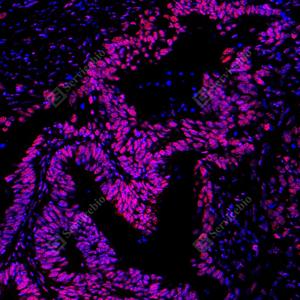 | IF检测HDAC1蛋白(货号 GB15333)(红色). 样品: 人肺癌, 4%多聚甲醛 (货号G1101) 固定12-24小时. 抗原修复: 抗原修复仪 (货号 ARI-4),Tris-EDTA抗原修复液(pH 9.0) (货号G1203), 水浴90℃, 30分钟. 封闭: 3% BSA(货号GC305010)的PBS溶液, 室温孵育30分钟. —抗: 1: 250稀释, 4℃ 孵育过夜. 二抗: Cy3标记山羊抗兔IgG (H+L) (货号GB21303), 1: 300稀释, 室温孵育1小时. |