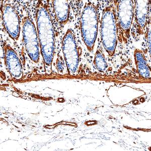 | IHC检测Caveolin-1蛋白(货号 GB15409). 样品: 人结肠, 4%多聚甲醛 (货号G1101) 固定12-24小时. 抗原修复: 抗原修复仪 (货号 ARI-4),Tris-EDTA抗原修复液(pH 9.0) (货号G1203), 水浴100℃, 25分钟. —抗: 1: 2000稀释, 4℃ 孵育过夜. 二抗: S-vision免疫组化多聚二抗(山羊抗小鼠), 即用型(货号G1301), 室温孵育20分钟. |