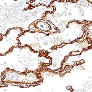 | IHC检测Caveolin-1蛋白(货号 GB15409). 样品: 人肺, 4%多聚甲醛 (货号G1101) 固定12-24小时. 抗原修复: 抗原修复仪 (货号 ARI-4),Tris-EDTA抗原修复液(pH 9.0) (货号G1203), 水浴100℃, 25分钟. —抗: 1: 2000稀释, 4℃ 孵育过夜. 二抗: S-vision免疫组化多聚二抗(山羊抗小鼠), 即用型(货号G1301), 室温孵育20分钟. |