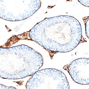 | IHC检测Caveolin-1蛋白(货号 GB15409). 样品: 小鼠睾丸, 4%多聚甲醛 (货号G1101) 固定12-24小时. 抗原修复: 抗原修复仪 (货号 ARI-4),Tris-EDTA抗原修复液(pH 9.0) (货号G1203), 水浴100℃, 25分钟. —抗: 1: 2000稀释, 4℃ 孵育过夜. 二抗: S-vision免疫组化多聚二抗(山羊抗小鼠), 即用型(货号G1301), 室温孵育20分钟. |