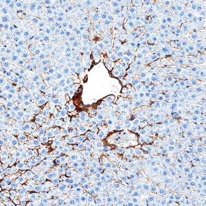 | IHC检测Caveolin-1蛋白(货号 GB15409). 样品: 大鼠肝, 4%多聚甲醛 (货号G1101) 固定12-24小时. 抗原修复: 抗原修复仪 (货号 ARI-4),Tris-EDTA抗原修复液(pH 9.0) (货号G1203), 水浴100℃, 25分钟. —抗: 1: 2000稀释, 4℃ 孵育过夜. 二抗: S-vision免疫组化多聚二抗(山羊抗小鼠), 即用型(货号G1301), 室温孵育20分钟. |