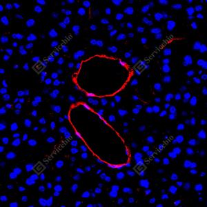 | IF检测Caveolin-1蛋白(货号 GB15409)(红色). 样品: 小鼠肝, 4%多聚甲醛 (货号G1101) 固定12-24小时. 抗原修复: 抗原修复仪 (货号 ARI-4),Tris-EDTA抗原修复液(pH 9.0) (货号G1203), 水浴100℃, 25分钟. 封闭: 3% BSA(货号GC305010)的PBS溶液, 室温孵育30分钟. —抗: 1: 2000稀释, 4℃ 孵育过夜. 二抗: Cy3标记山羊抗小鼠IgG (H+L) (货号GB21301), 1: 300稀释, 室温孵育1小时. |