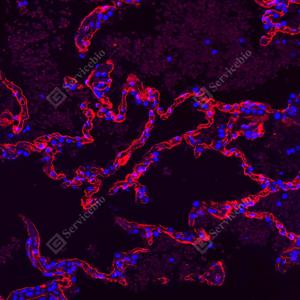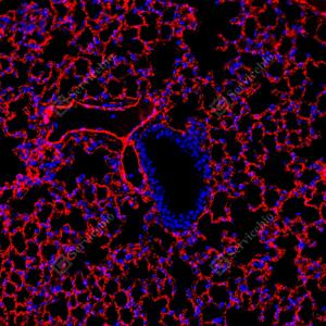 | IF检测Caveolin-1蛋白(货号 GB15409)(红色). 样品: 小鼠肺, 4%多聚甲醛 (货号G1101) 固定12-24小时. 抗原修复: 抗原修复仪 (货号 ARI-4),Tris-EDTA抗原修复液(pH 9.0) (货号G1203), 水浴100℃, 25分钟. 封闭: 3% BSA(货号GC305010)的PBS溶液, 室温孵育30分钟. —抗: 1: 2000稀释, 4℃ 孵育过夜. 二抗: Cy3标记山羊抗小鼠IgG (H+L) (货号GB21301), 1: 300稀释, 室温孵育1小时. |