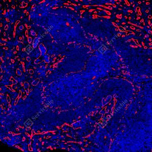 | IF检测Caveolin-1蛋白(货号 GB15409)(红色). 样品: 大鼠脾, 4%多聚甲醛 (货号G1101) 固定12-24小时. 抗原修复: 抗原修复仪 (货号 ARI-4),Tris-EDTA抗原修复液(pH 9.0) (货号G1203), 水浴100℃, 25分钟. 封闭: 3% BSA(货号GC305010)的PBS溶液, 室温孵育30分钟. —抗: 1: 2000稀释, 4℃ 孵育过夜. 二抗: Cy3标记山羊抗小鼠IgG (H+L) (货号GB21301), 1: 300稀释, 室温孵育1小时. |