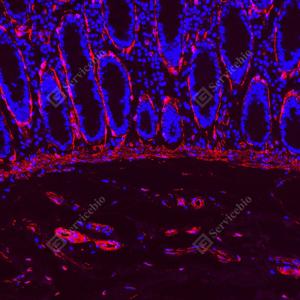 | IF检测Caveolin-1蛋白(货号 GB15409)(红色). 样品: 人结肠, 4%多聚甲醛 (货号G1101) 固定12-24小时. 抗原修复: 抗原修复仪 (货号 ARI-4),Tris-EDTA抗原修复液(pH 9.0) (货号G1203), 水浴100℃, 25分钟. 封闭: 3% BSA(货号GC305010)的PBS溶液, 室温孵育30分钟. —抗: 1: 2000稀释, 4℃ 孵育过夜. 二抗: Cy3标记山羊抗小鼠IgG (H+L) (货号GB21301), 1: 300稀释, 室温孵育1小时. |