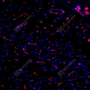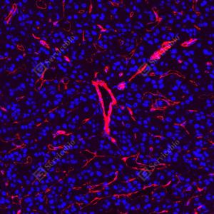 | IF检测Caveolin-1蛋白(货号 GB15409)(红色). 样品: 大鼠脑, 4%多聚甲醛 (货号G1101) 固定12-24小时. 抗原修复: 抗原修复仪 (货号 ARI-4),Tris-EDTA抗原修复液(pH 9.0) (货号G1203), 水浴100℃, 25分钟. 封闭: 3% BSA(货号GC305010)的PBS溶液, 室温孵育30分钟. —抗: 1: 2000稀释, 4℃ 孵育过夜. 二抗: Cy3标记山羊抗小鼠IgG (H+L) (货号GB21301), 1: 300稀释, 室温孵育1小时. |