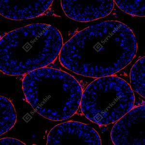 | IF检测Caveolin-1蛋白(货号 GB15409)(红色). 样品: 小鼠睾丸, 4%多聚甲醛 (货号G1101) 固定12-24小时. 抗原修复: 抗原修复仪 (货号 ARI-4),Tris-EDTA抗原修复液(pH 9.0) (货号G1203), 水浴100℃, 25分钟. 封闭: 3% BSA(货号GC305010)的PBS溶液, 室温孵育30分钟. —抗: 1: 2000稀释, 4℃ 孵育过夜. 二抗: Cy3标记山羊抗小鼠IgG (H+L) (货号GB21301), 1: 300稀释, 室温孵育1小时. |