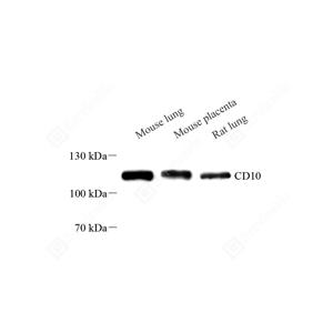 WB检测CD10蛋白(货号 GB121120). 样品: 经RIPA裂解液(货号G2002)处理的蛋白质. 封闭: 3%脱脂牛奶(货号GC310001)溶于TBST溶液, 室温孵育1小时. —抗: 1: 500稀释, 4℃ 孵育过夜. 二抗: HRP标记山羊抗小鼠IgG (H+L) (货号GB23301), 1: 5000稀释, 室温孵育1小时. |