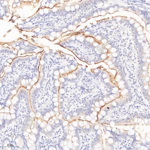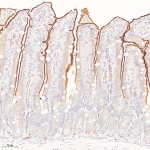 IHC检测CD10蛋白(货号 GB121120). 样品: 小鼠小肠, 4%多聚甲醛 (货号G1101) 固定12-24小时. 抗原修复: 柠檬酸抗原修复液(干粉, pH 6.0) (G1201), 高压锅均匀喷气计时2分钟. —抗: 1: 500稀释, 4℃ 孵育过夜. 二抗: HRP标记山羊抗小鼠IgG (H+L) (货号GB23301), 1: 200稀释, 室温孵育1小时. |