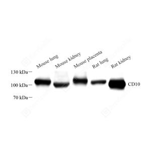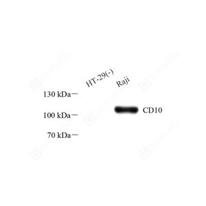 WB检测CD10蛋白(货号 GB114689). 样品: 经RIPA裂解液(货号G2002)处理的蛋白质. 封闭: 3%脱脂牛奶(货号GC310001)溶于TBST溶液, 室温孵育1小时. —抗: 1: 1000稀释, 4℃ 孵育过夜. 二抗: HRP标记山羊抗兔IgG (H+L) (货号GB23303), 1: 5000稀释, 室温孵育1小时. |