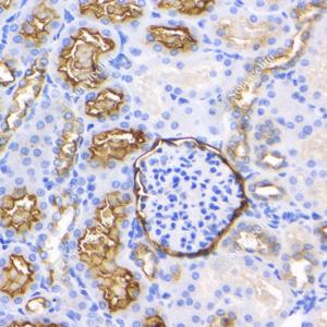 IHC检测CD10蛋白(货号 GB114689). 样品: 小鼠肾, 4%多聚甲醛 (货号G1101) 固定12-24小时. 抗原修复: 柠檬酸抗原修复液(干粉, pH 6.0) (G1201), 98℃, 20分钟. —抗: 1: 800稀释, 4℃ 孵育过夜. 二抗: HRP标记山羊抗兔IgG (H+L) (货号GB23303), 1: 200稀释, 室温孵育1小时. |