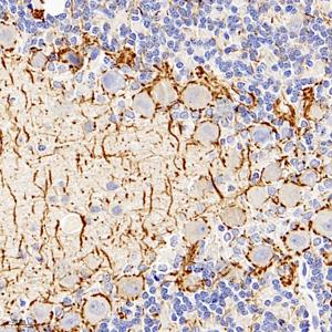 | IHC检测160 kDa Neurofilament Medium蛋白(货号 GB12763). 样品: 大鼠小脑, 4%多聚甲醛 (货号G1101) 固定12-24小时. 抗原修复: 柠檬酸抗原修复液(干粉, pH 6.0) (G1201), 98℃, 20分钟. —抗: 1: 1000稀释, 4℃ 孵育过夜. 二抗: HRP标记山羊抗小鼠IgG (H+L) (货号GB23301), 1: 200稀释, 室温孵育1小时. |