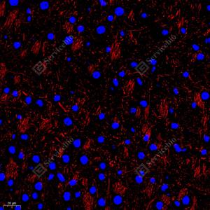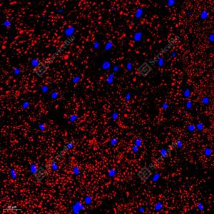 | IF检测160 kDa Neurofilament Medium蛋白(货号 GB12763)(红色). 样品: 大鼠脑, 4%多聚甲醛 (货号G1101) 固定12-24小时. 抗原修复: Tris-EDTA抗原修复液(pH 9.0) (G1203), 98℃, 20分钟. 封闭: 3% BSA(货号GC305010)的PBS溶液, 室温孵育30分钟. —抗: 1: 500稀释, 4℃ 孵育过夜. 二抗: Cy3标记山羊抗小鼠IgG (H+L) (货号GB21301), 1: 300稀释, 室温孵育1小时. |