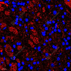 | IF检测160 kDa Neurofilament Medium蛋白(货号 GB12763)(红色). 样品: 小鼠脊髓, 4%多聚甲醛 (货号G1101) 固定12-24小时. 抗原修复: Tris-EDTA抗原修复液(pH 9.0) (G1203), 98℃, 20分钟. 封闭: 3% BSA(货号GC305010)的PBS溶液, 室温孵育30分钟. —抗: 1: 500稀释, 4℃ 孵育过夜. 二抗: Cy3标记山羊抗小鼠IgG (H+L) (货号GB21301), 1: 300稀释, 室温孵育1小时. |