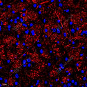 | IF检测160 kDa Neurofilament Medium蛋白(货号 GB12763)(红色). 样品: 小鼠脑, 4%多聚甲醛 (货号G1101) 固定12-24小时. 抗原修复: Tris-EDTA抗原修复液(pH 9.0) (G1203), 98℃, 20分钟. 封闭: 3% BSA(货号GC305010)的PBS溶液, 室温孵育30分钟. —抗: 1: 500稀释, 4℃ 孵育过夜. 二抗: Cy3标记山羊抗小鼠IgG (H+L) (货号GB21301), 1: 300稀释, 室温孵育1小时. |