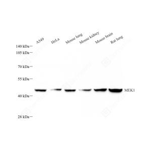 WB检测MEK1蛋白(货号 GB15601). 样品: 经RIPA裂解液(货号G2002)处理的蛋白质. 封闭: 3%脱脂牛奶(货号GC310001)溶于TBST溶液, 室温孵育1小时. —抗: 1: 1000稀释, 4℃ 孵育过夜. 二抗: HRP标记山羊抗小鼠IgG (H+L) (货号GB23301), 1: 5000稀释, 室温孵育1小时. |