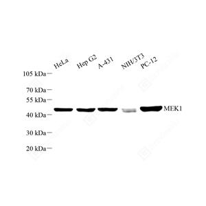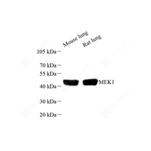 WB检测MEK1蛋白(货号 GB15600). 样品: 经RIPA裂解液(货号G2002)处理的蛋白质. 封闭: 3%脱脂牛奶(货号GC310001)溶于TBST溶液, 室温孵育1小时. —抗: 1: 500稀释, 4℃ 孵育过夜. 二抗: HRP标记山羊抗兔IgG (H+L) (货号GB23303), 1: 5000稀释, 室温孵育1小时. |