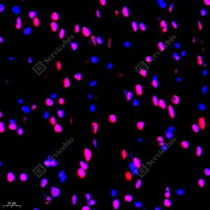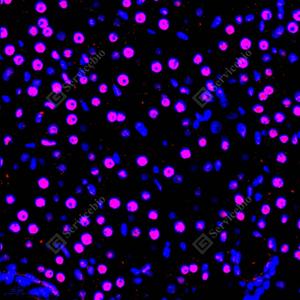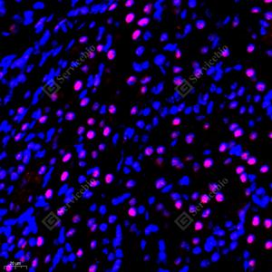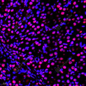 IF检测MEK1蛋白(货号 GB11304)(红色). 样品: 大鼠卵巢, 4%多聚甲醛 (货号G1101) 固定12-24小时. 抗原修复: Tris-EDTA抗原修复液(pH 9.0) (G1203), 98℃, 20分钟. 封闭: 3% BSA(货号GC305010)的PBS溶液, 室温孵育30分钟. —抗: 1: 100稀释, 4℃ 孵育过夜. 二抗: Cy3标记山羊抗兔IgG (H+L) (货号GB21303), 1: 300稀释, 室温孵育1小时. |