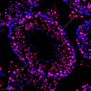 IF检测MEK1蛋白(货号 GB11304)(红色). 样品: 小鼠睾丸, 4%多聚甲醛 (货号G1101) 固定12-24小时. 抗原修复: Tris-EDTA抗原修复液(pH 9.0) (G1203), 98℃, 20分钟. 封闭: 3% BSA(货号GC305010)的PBS溶液, 室温孵育30分钟. —抗: 1: 100稀释, 4℃ 孵育过夜. 二抗: Cy3标记山羊抗兔IgG (H+L) (货号GB21303), 1: 300稀释, 室温孵育1小时. |