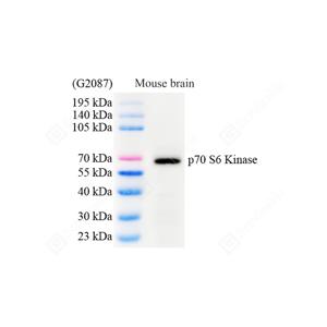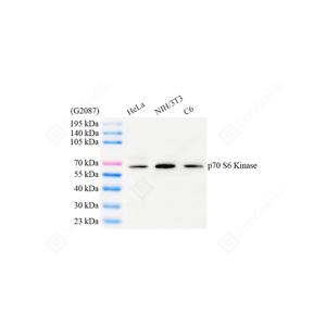 RPS6KB1(Ribosomal protein S6 kinase beta-1) is also named as STK14A, p70 S6KA and belongs to the S6 kinase subfamily. RPS6KB1 is a major substrate of MTOR and acts as a crucial effector of MTOR signaling pathway. It plays a key role in cell growth and proliferation by regulating INS sensitivity, metabolism, protein synthesis, and cell cycle. RPS6KB1 may play an important role in the progression of HCC and could serve as a potential molecular target for HCC therapy . RPS6KB1 is a 70 kDa protein and has 5 isoforms with the calculated molecular mass of 51-59 kDa produced by alternative initiation.